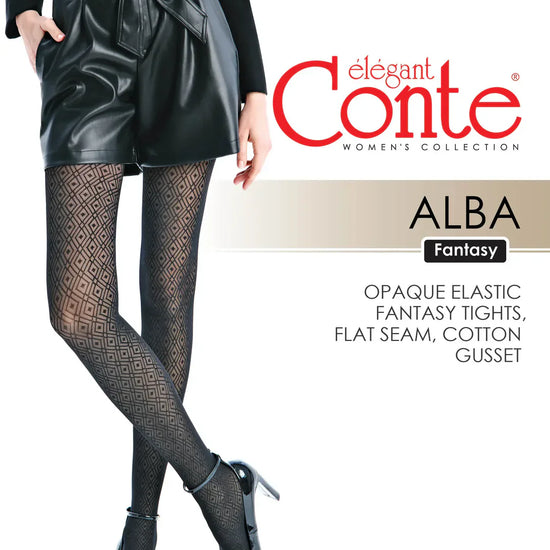 Opaque elastic women’s tights ALBA with a geometric diamond pattern along the entire length. The tights feature a flat seam and a cotton gusset for maximum comfort.