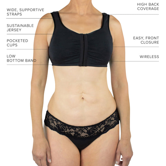 The Maia Bra is a soft bra designed for easy on off and made with ultra-soft, breathable and sustainable Jersey that is naturally cooling and anti-microbial. The hook & eye front closure makes it ideal for limited arm mobility and those recovering from surgery. Offering light compression and ultimate comfort, it's ideal for lumpectomy, mastectomy, explant surgery, heart surgery or reconstruction.