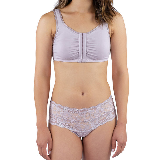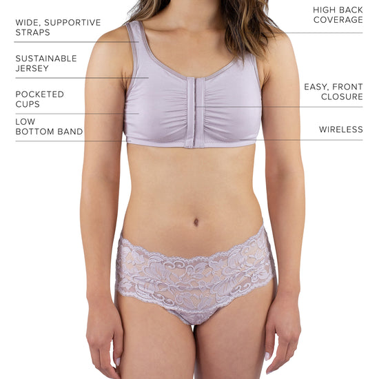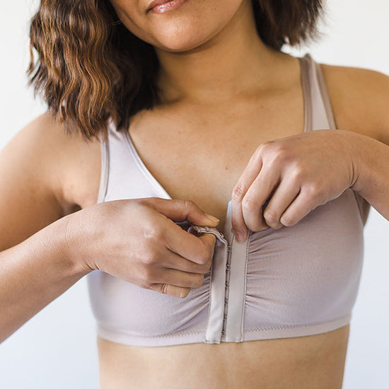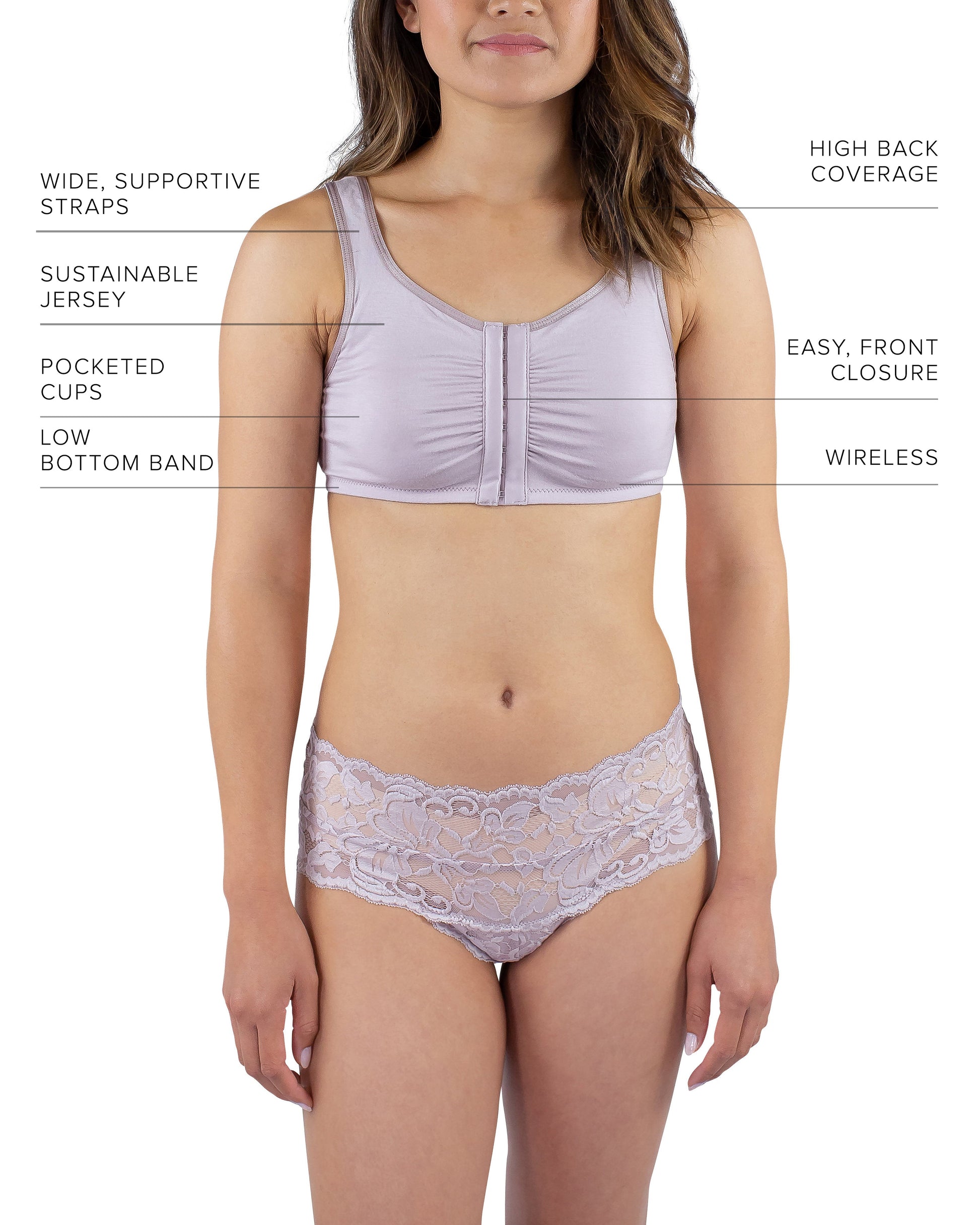 The Maia Bra is a soft bra designed for easy on off and made with ultra-soft, breathable and sustainable Jersey that is naturally cooling and anti-microbial. The hook & eye front closure makes it ideal for limited arm mobility and those recovering from surgery. Offering light compression and ultimate comfort, it's ideal for lumpectomy, mastectomy, explant surgery, heart surgery or reconstruction.