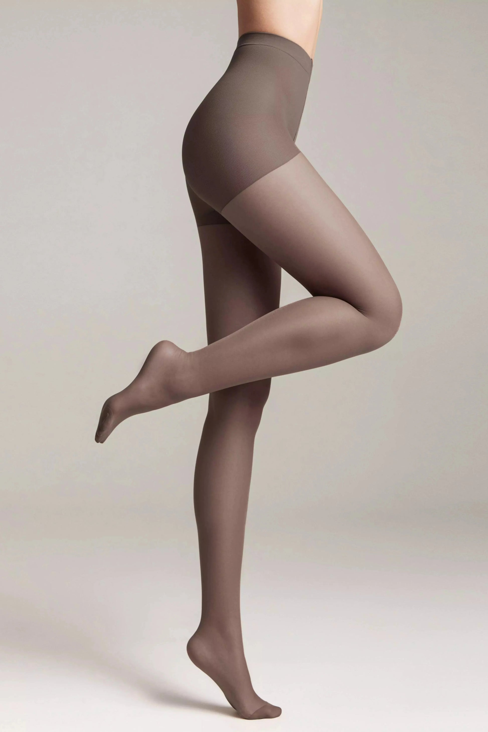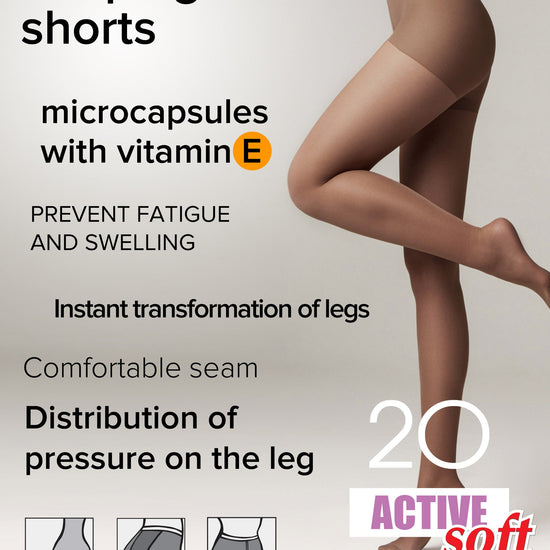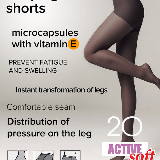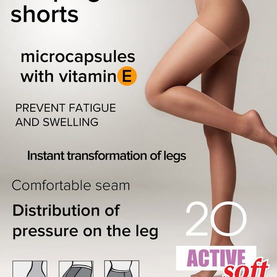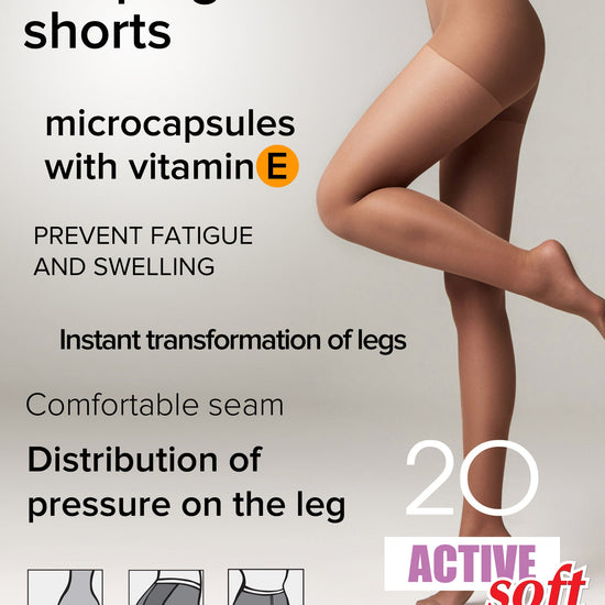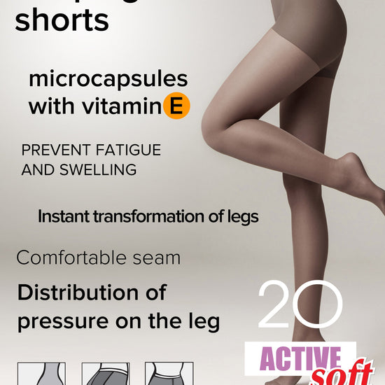 Transparent tights with shaping shorts ACTIVE SOFT 20 model the figure, visually reducing the volume of hips, waist, and abdomen. Distributed pressure along the leg helps prevent fatigue and swelling. These tights are specially designed for sensitive skin: the top is treated with microcapsules of vitamin E to care for the skin of the legs.
